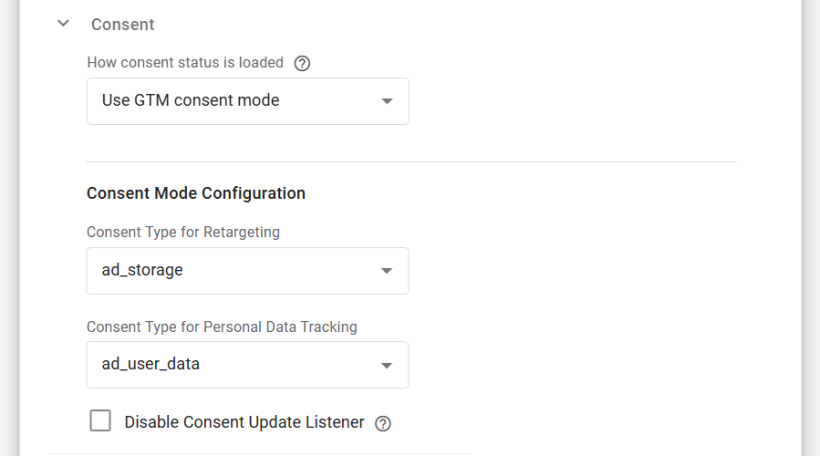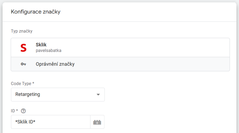 Zde je nejjednodušší využít šablonu Skliku, do které si doplníte pouze potřebné údaje jako ID a nastavíte, jakým consentem se má tento tag řídit. Nastavení šablony by mělo být následující: